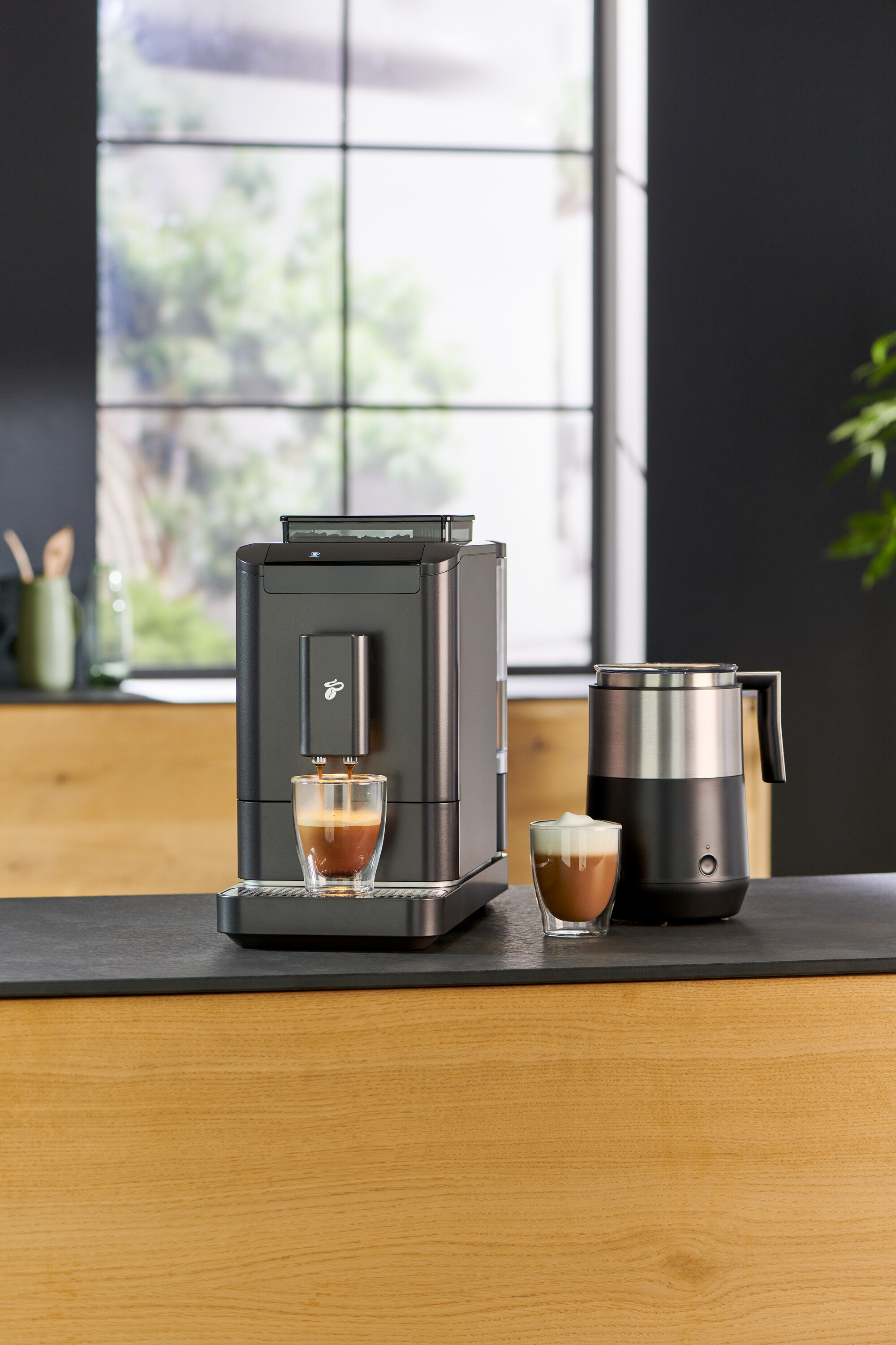 A Tchibo automata kávéfőzője nemcsak a felhasználóbarát használat, az ár-érték arány és a Stiftung Warentest (német fogyasztóvédelmi szervezet) tesztjén (értékelés: „JÓ”) teljesít kitűnően, de igazán mutatós darab is a konyhában. Az elegáns nemesacél és a sima előlap a letisztult érintőképernyővel minőségi benyomást kelt. Csupán 18 cm-es szélességével ez az automata barista kitűnően elfér a legkisebb zugokban is, ha a munkalapon nincs túl sok tárolóhely.
