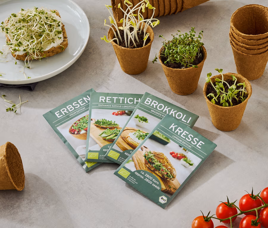 - 4 mikrozöldet tartalmaz, egyenként csomagolva: retek, borsó, brokkoli, zsázsa