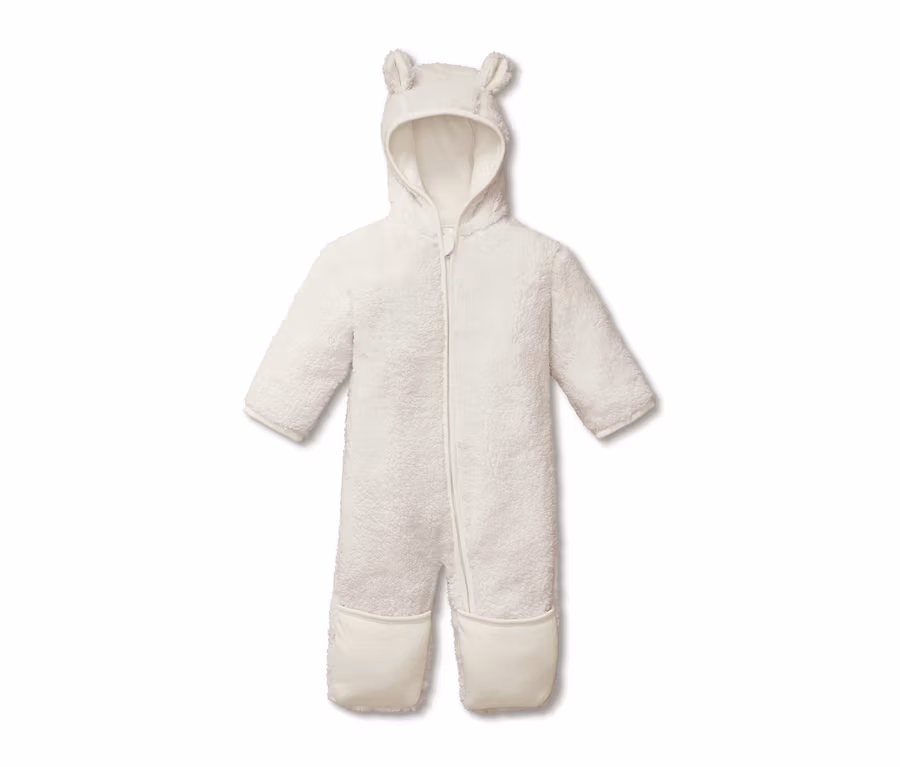 Nagyon aranyosan mutatnak a kicsik ebben a plüss kezeslábasban! Az olyan játékos részletek, mint a kapucninál lévő kis fülek és a plüss anyag pihe-puha jegesmacivá változtatják a gyerekeket. A rugdalózó bélése puha biopamutból készült, ezáltal kellemes viseletet biztosít. A hosszú cipzár pedig nem csak azért praktikus, mert megkönnyíti az öltöztetést, hanem azért is, mert külön állvédővel is ellátták.