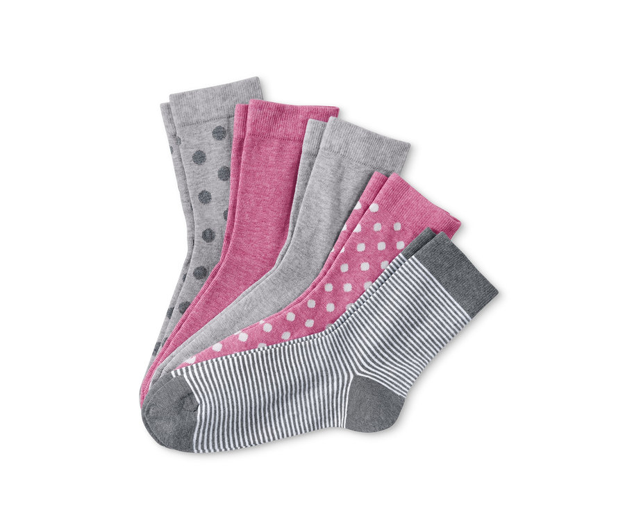 Ez az öt pár barátságos színben készült zokni kényelmes kísérőként szolgál. A női zoknik biopamutot tartalmaznak, az elasztán pedig formatartásról, tökéletes illeszkedésről és rendkívül kényelmes viseletről gondoskodik. Orrhegyük és sarkuk megerősített, kényelmes szegélyük tartást kölcsönöz, közben pedig nem vág be.