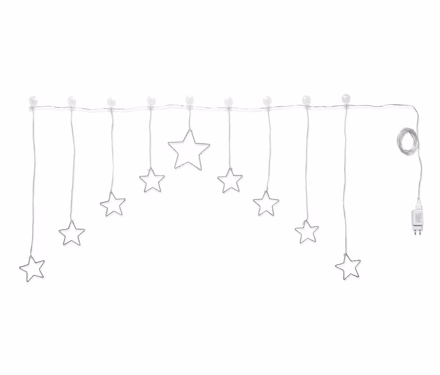 Ragyogó csillagokkal teli ablak: ez a hangulatosan világító fényfüggöny világító LED-es csillagjaival a karácsony varázsát hozza el otthonába. Az egy nagy csillagból és nyolc kicsi csillagból álló függöny az átlátszó tapadókorongok és akasztók segítségével nagyon könnyen az ablakra vagy az ablakkeretre rögzíthetők. Ezáltal a melegfehér fénnyel világító fémcsillagok különösen jól érvényesülnek és úgy tűnnek, mintha az ablaküvegen lebegnének.