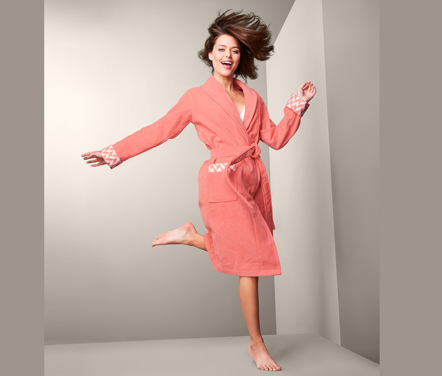 A lazacszínű köntös divat tekintetében is megállja helyét: így például csinos szegélyekkel látták el a zsebeknél és az ujjfelhajtásoknál. A két zseb mellett további olyan részletek teszik mutatóssá a köntöst, mint a sálgallér és a megkötő, ezek ugyanis különösen praktikussá teszik a vádliig érő fürdőköpenyt. Az akasztó szintén praktikus, hiszen a köntös ennek segítségével könnyen hozzáférhető módon tárolható a fürdőszobában.