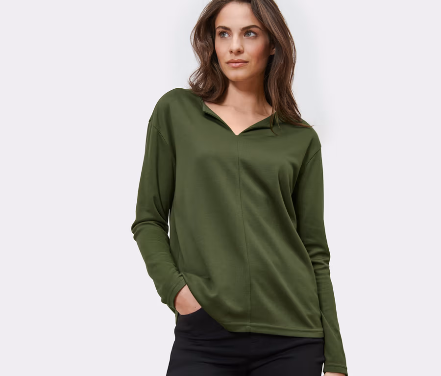 Női hosszú ujjú pólóblúz, V-nyakú, olívazöld