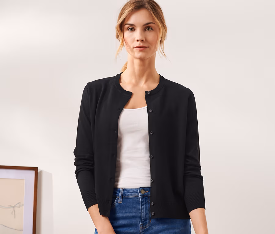 • Ez a kötött kardigán fenntartható fából készült szálakat tartalmaz.