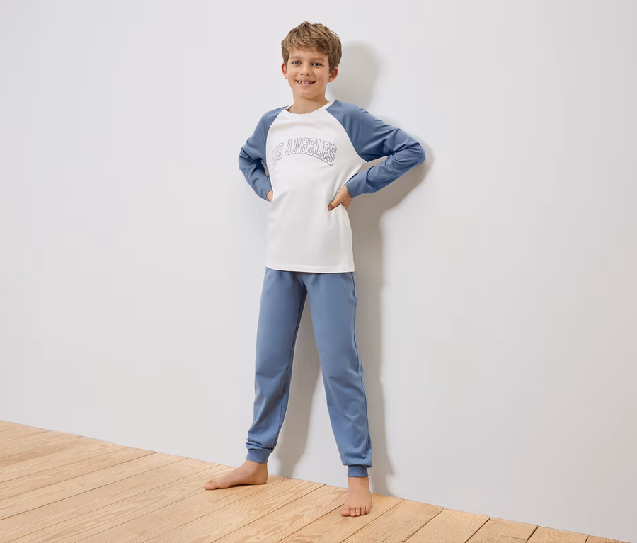 - 1x felsőrész fehér alapon kék betűs mintával és égszínkék ujjakkal, égszínkék nadrág
