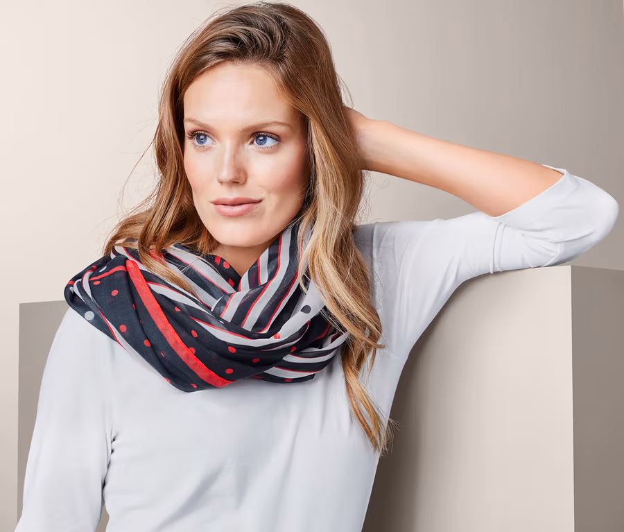 Női csősál, mintás, piros/kék/fehér