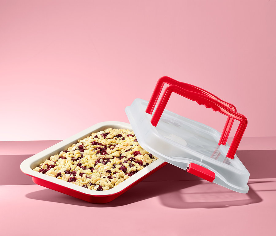Süssünk még gyorsan egy sütit, fedelet rá és már indulhatunk is piknikezni: ennek a tepsinek és a hozzáillő fedélnek köszönhetően már szállításra készen kerül ki a finom sütemény a sütőből. Amint sütés után lehűlt a forma, máris ráhelyezheti a hordozófülekkel ellátott, lezárható fedelet. A GREBLON® B1 tapadásmentes bevonat csökkenti a tészta letapadását és megkönnyíti a tepsi tisztítását. Az első kreációk elkészítéséhez receptjavaslatokat is mellékelünk a tepsihez.