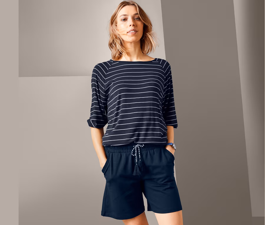 Ezzel a kellemesen puha, pamut kevertszálas anyagból készült jersey rövidnadrággal tökéletesen felkészülhet a melegebb napokra. Széles, rugalmas övrészének köszönhetően a nadrág szuper kényelmes. Az övrész kis ráncolásokkal van ellátva, a megkötőt pedig ezüstösen csillogó szálakkal átszőtt rojtok díszítik. A két bevágott zseb a hímzésekkel szintén nyárias hangulatú. A rövidnadrág biopamuttal készült, elasztántartalma pedig formatartásról és tökéletes illeszkedésről gondoskodik.