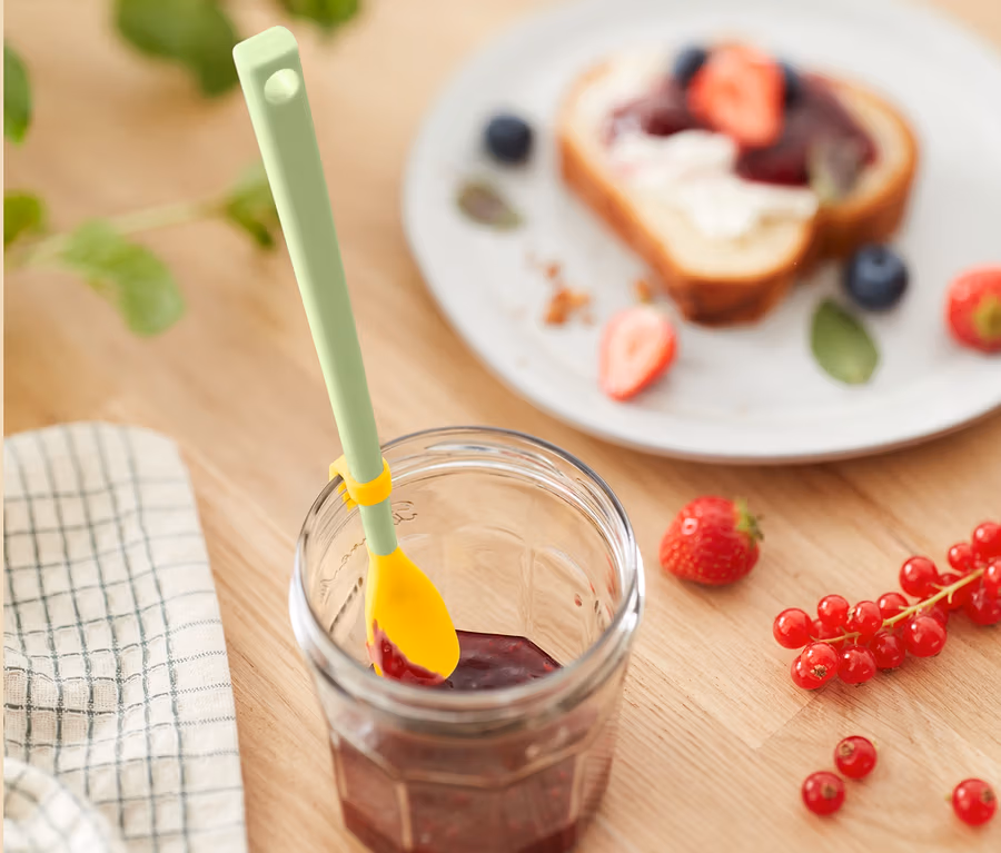 • Speciális formájú kanál rugalmas szilikonból a lekvárosüvegek maradéktalan kiürítéséhez
