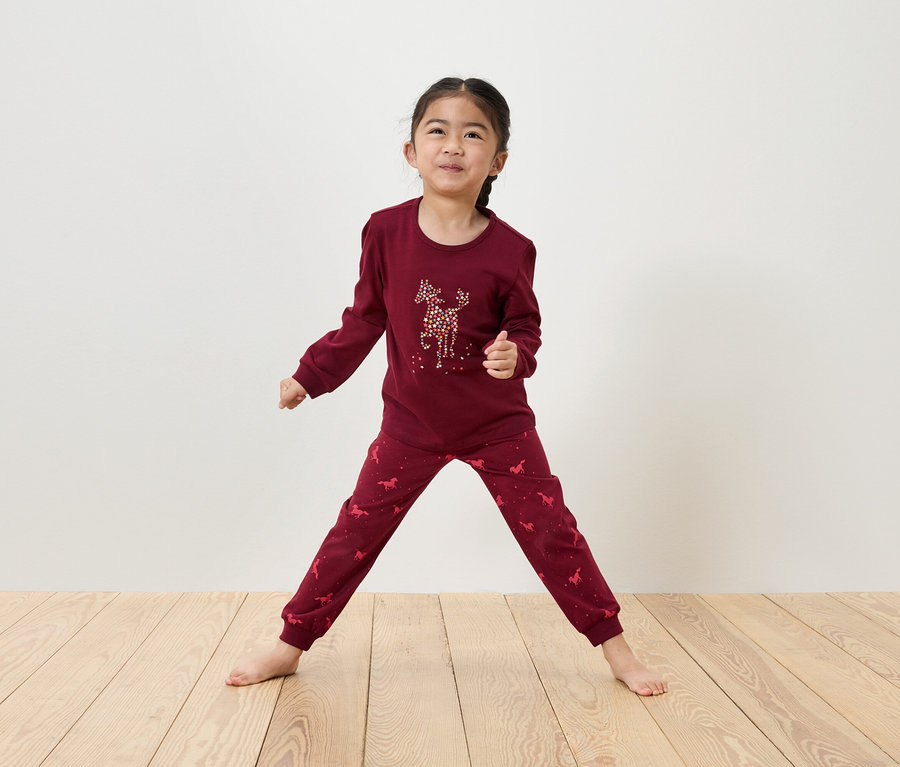 - Felsőrész: bordó, elhelyezett, többszínű mintával. Nadrág: bordó, világospiros nyomott mintával és szegéllyel