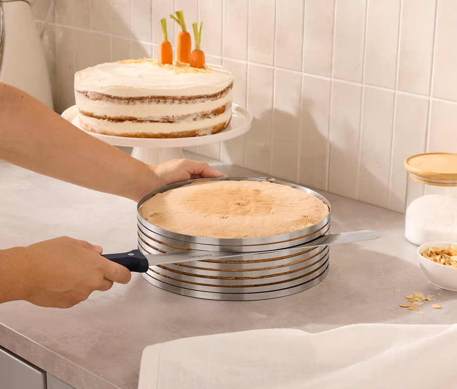 - Lehetővé teszi a tortaalapnak egyszerű, akár 8 egyenlő vastagságú rétegre történő szeletelésére