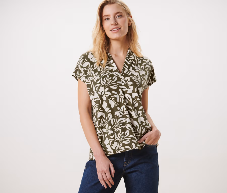Mintás pólóblúz V-nyakkivágással