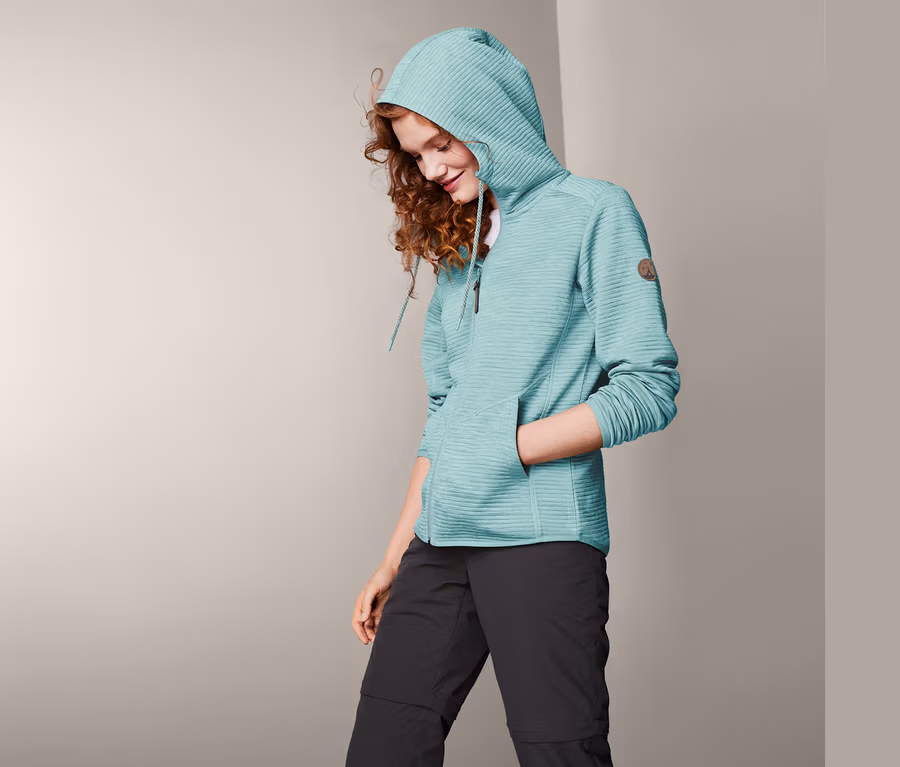 A női felső két bevágott zsebbel és egy olyan elülső cipzárral rendelkezik, amelyet állvédővel láttak el. A kapucni húzózsinóros. A túrafelső strukturált anyagának köszönheti divatos megjelenését, bőrhatású elemei pedig stílusos viseletről gondoskodnak.