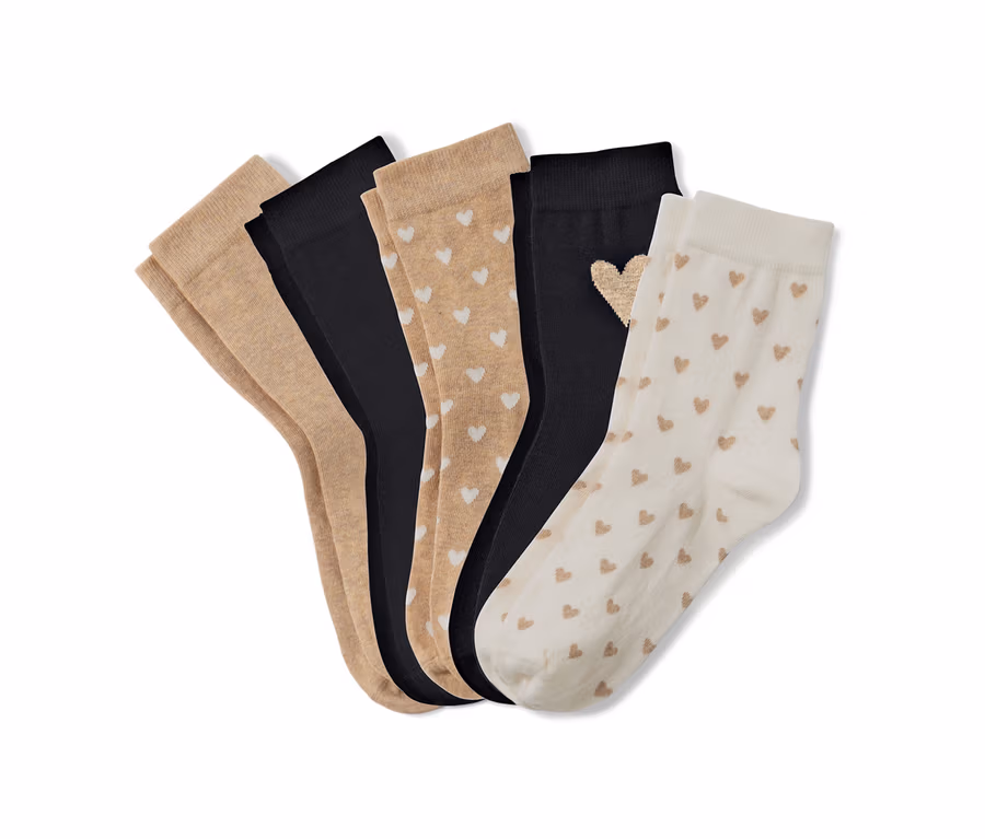 - 1x melírozott bézs, krémfehér belekötött szívmintával, 1x fekete, 1x fekete, melírozott bézs belekötött szívmintával a zokniszáron, 1x melírozott bézs, 1x krémfehér, melírozott bézs belekötött szívmintával