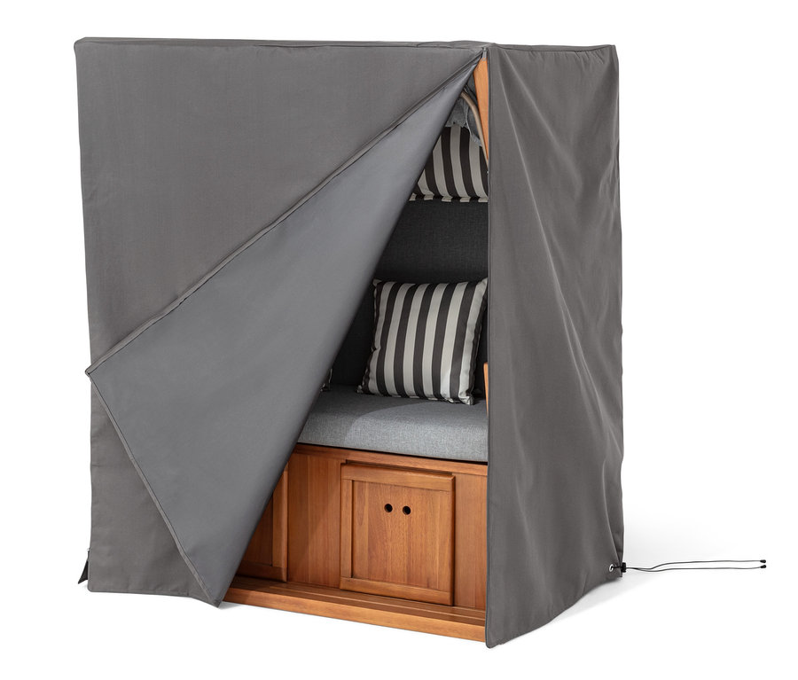 • Az elülső sarkokon található 2 cipzár teszi lehetővé a strandkosarak méretre szabott takaróval való használatát