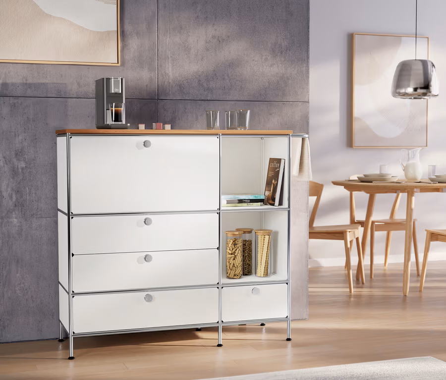»CN3« fém komód fa felső lappal, 1 lenyíló ajtóval és 4 fiókkal, fehér