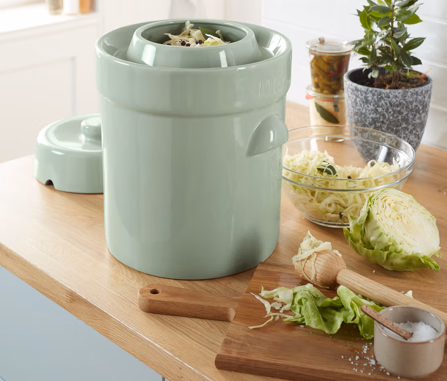 Javasoljuk, hogy az edényt minden használat előtt öblítse ki ne túl forró vízzel. Töltse meg az edényt, majd a mellékelt köveket addig nyomja a zöldségre, amíg a folyadék el nem lepi a nehezékeket. Tegye a fedelet az edényre, majd töltse meg a vízelvezetőt vízzel. Így az edény légmentesen lezárható, a zöldség pedig akár egy évig vagy tovább is eltartható.