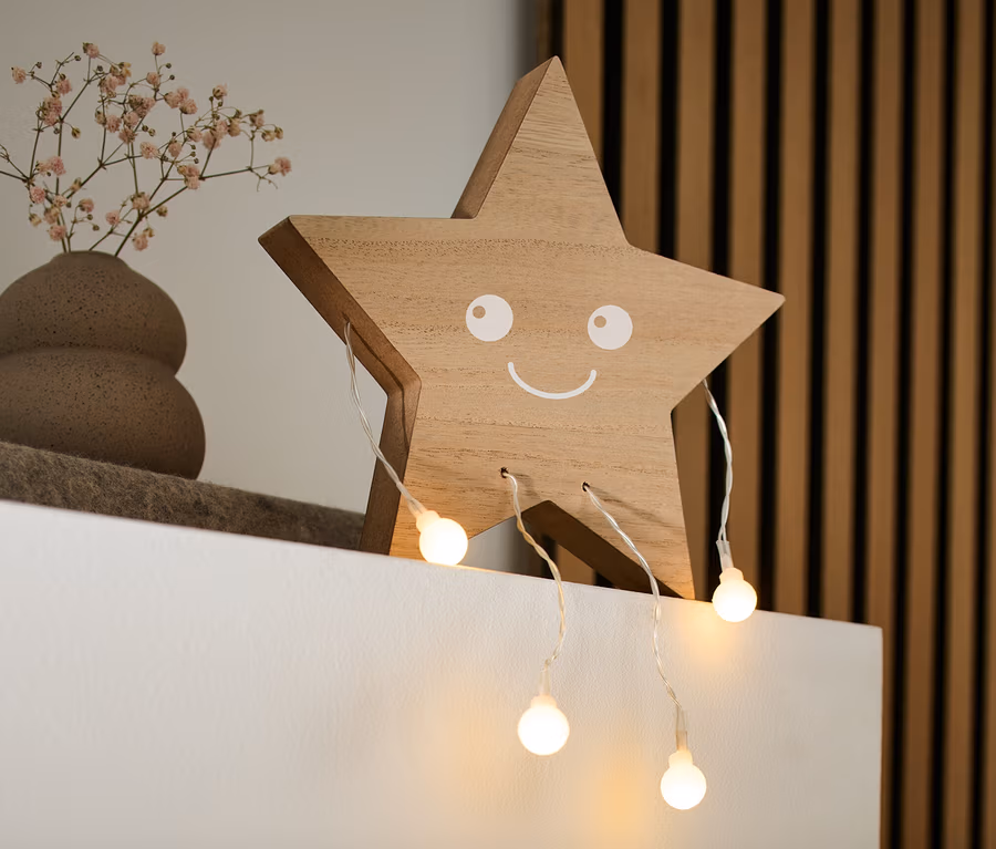 - Csillag: natúr színű fa, fehér arccal