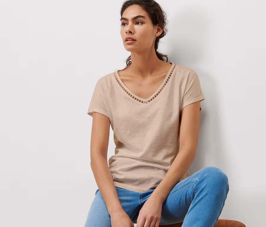 - V-nyakkivágás mutatós, horgolt díszítéssel