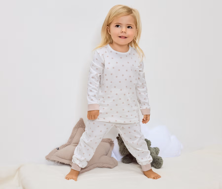 - 1x fehér felső és nadrág pasztellrózsaszín csillagmintával