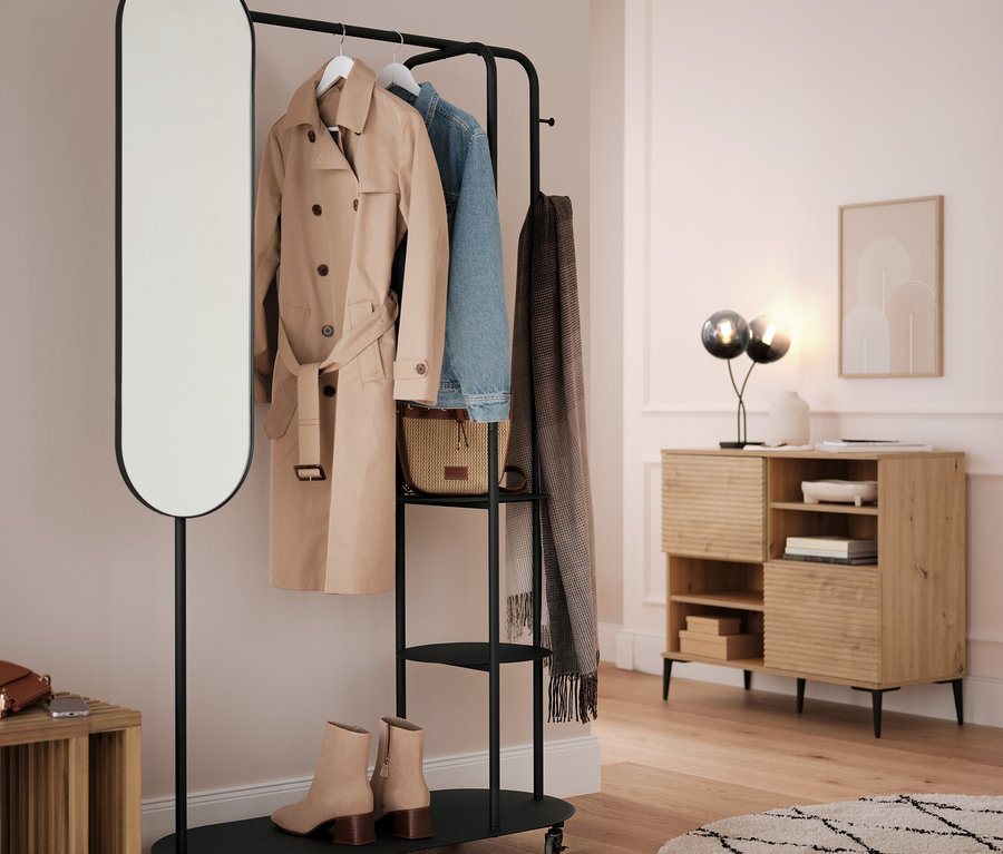 - Tükör fémkeretben, vállfatartó rúd két végelzáróval, 2 akasztó, 2 kerek polc, 4 görgő