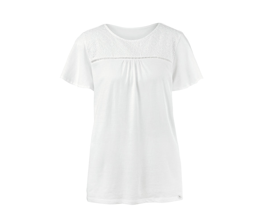 Ebben a felsőben gondtalanul élvezheti a napot, hiszen annak pamut- és viszkóztartalmú, különösen lágy esésű anyaga egyszerűen kellemes viseletet biztosít. Ezen kívül a jerseyfelső az elejét díszítő lyukhímzésnek köszönhetően rendkívül divatos. A tiszta pamutból készült ruhadarab a lágy esésű japánujjakkal együtt laza és játékos megjelenésről gondoskodik. A felsőrész alsó szegélyét díszítő fémlemezke mutatós részletként szolgál.