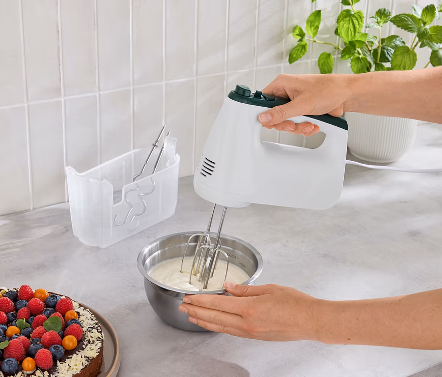 Tárolódobozzal, habverővel, dagasztóspirállal és használati útmutatóval