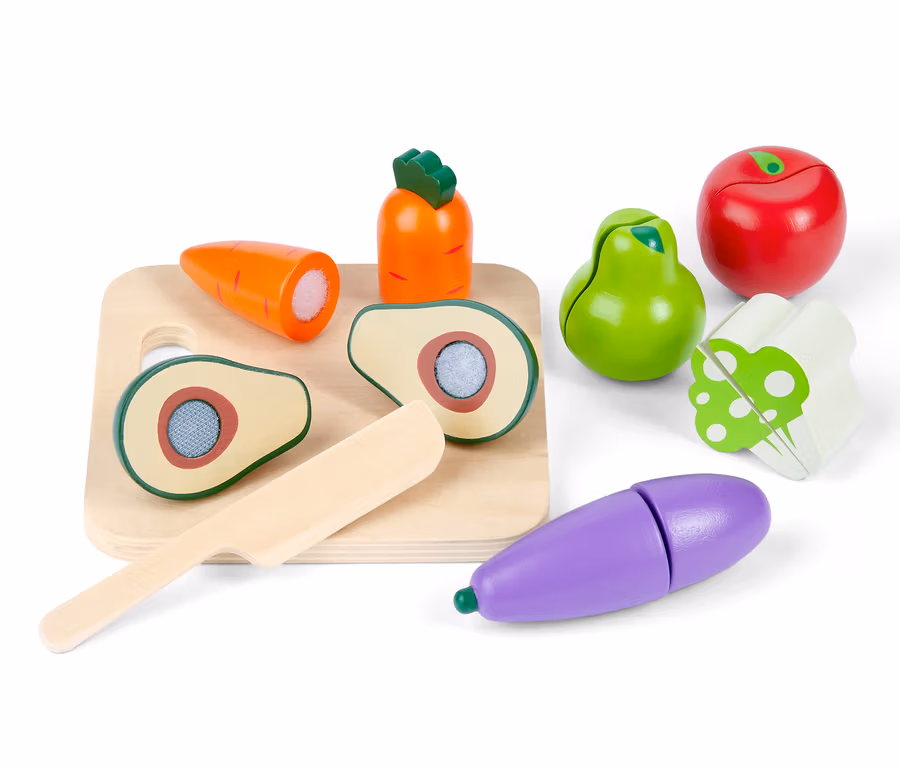 - 8 részes: 1 vágódeszka, 1 kés, 1 körte, 1 brokkoli, 1 répa, 1 avokádó, 1 padlizsán, 1 alma