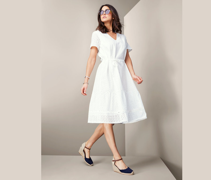 Egy nyári kisruhának fesztelen könnyedséget kell sugároznia - akárcsak ennek a ruhának, amely végigfutó lyukhímzésével, valamint az alsó szegélynél és az ujjvégen található horgolt betoldásával ideális viseletet biztosít a szép napokon. A V-nyakkivágással ellátott ruha tiszta biopamutból készült. Így mindig kellemesen puhán és könnyedén simul a bőrre.