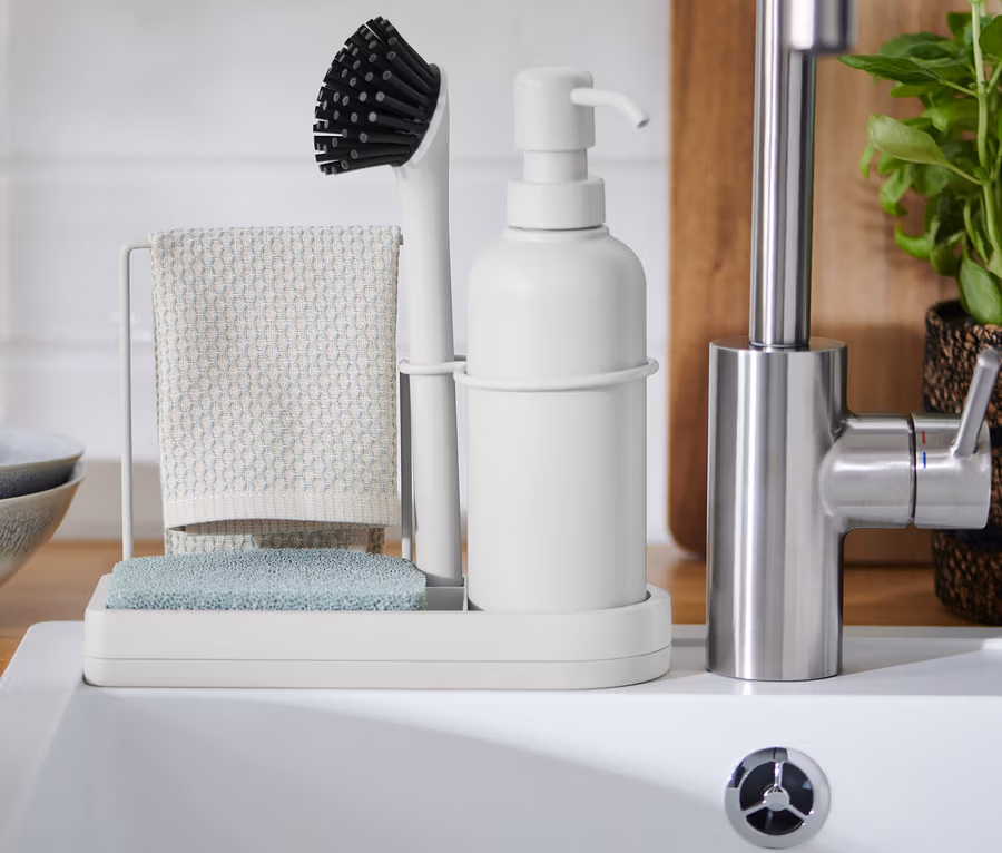 - Stílusos mosogatókészlet a mosogatókefe, mosogatószer-adagoló és mosogatórongy számára
