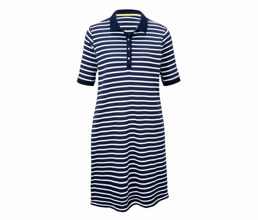 Egyszerűen tökéletesen illik egy laza nyári szetthez például tornacipővel vagy szandállal: ennek a tiszta biopamutból álló csíkos pólóruhának egyértelműen a klasszikus pólóing az elődje, trendi külsejét pedig galléros és gomboláspántos nyakkivágásának köszönheti. A gallér és az ujjvég bordázott, a ruha az A-vonalú szabás révén könnyed esésű, ezen kívül az alsó szegélyt díszítő fémlemezke mutatós megjelenésről gondoskodik.