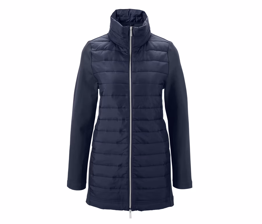 A kabátot elöl olyan rendkívül könnyű, meleg köztes réteggel látták el, amelynek köszönhetően viselője az alacsonyabb hőmérsékletekkel is dacolhat. Hátoldala és ujjai ezzel szemben lágy esésű jersey anyagból készültek – így a kabát minden mozdulathoz könnyedén igazodik. A kontrasztszínű elülső cipzár modern hatást kelt, a két cipzáras bevágott zseb pedig például a kesztyű vagy egyből maguknak a kezeknek biztosít helyet.