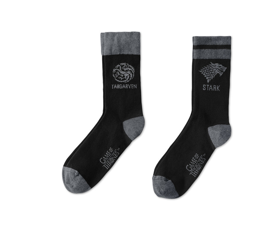 Ezért a két párért, amelyek a Targaryen és a Stark házak címerét és nevét viselik, minden "Got" rajongó odáig lesz. A puha, kevert pamutanyagból készült zoknik megerősített orrhegye és sarokrésze, valamint kényelmes szegélye tökéletes illeszkedésről gondoskodik minden helyzetben. A beledolgozott elasztán még kényelmesebb viseletet biztosít. Kedvenc sorozata mellett most már a telet is nyugodtan várhatja.