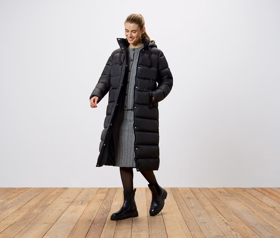 Steppelt kabát kapucnival, fekete