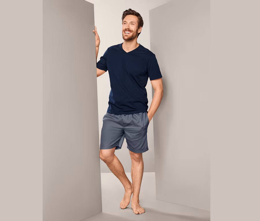 A jó éjszakához és a pihentető alváshoz a megfelelő ágyneműn kívül a kényelmes pizsama is hozzátartozik - és ez a rövidnadrágos pizsama ideális választás melegebb éjszakákon - vagy ha alvás közben amúgy is szellősebb viseletre vágyik. A V-nyakkivágással ellátott, puha single-jersey anyagú felsőrész és a puha pamut-twill anyagból álló nadrág tiszta pamutból készült és mindig kellemesen simul a bőrre. A felsőrészt V-nyakkivágással, a nadrágot pedig két bevágott zsebbel és kényelmes, rugalmas derékrésszel látták el.