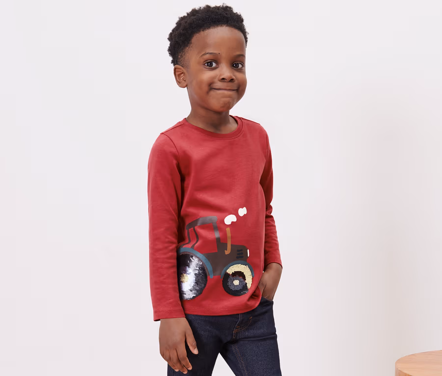 1x palakék többszínű nyomtatással, 1x piros többszínű traktormintával, 98/104 - 122/128-as méretekben többszínű megfordítható flitterekkel