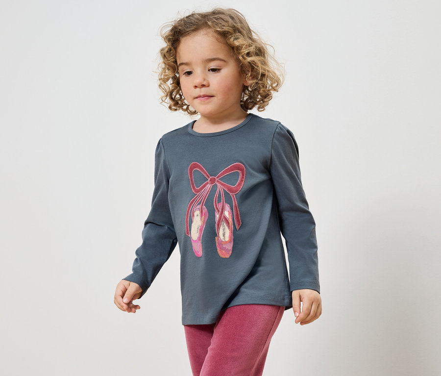 - Középkék, színes balettcipő-rátéttel és nyomott mintával