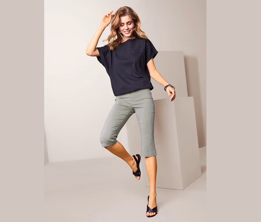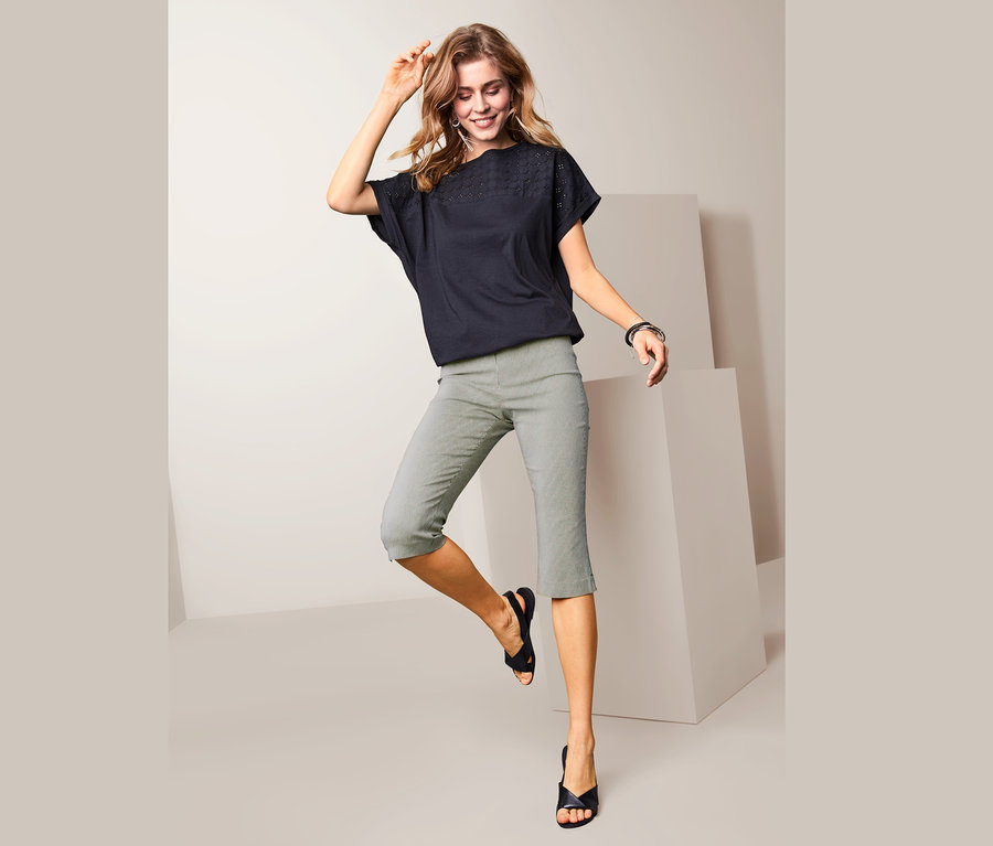 Nyáron is szeretjük a csinos - egyúttal kényelmes - ruhákat. Ez a sztreccsnadrág tökéletes alapként szolgál bármely szabadidős viselethez, 3/4-es hosszának köszönhetően pedig ideális a meleg nyár napokhoz. A női nadrág nagy arányban fenntartható viszkózt tartalmazó, rugalmas anyagával mindig kellemesen simul a bőrre, az elasztán pedig formatartásról és rendkívül kényelmes viseletről gondoskodik mozgás közben. A szűk nadrágszárral készült nadrág alsó szegélyét oldalhasítékokkal látták el. Derékrésze rugalmas és tökéletes illeszkedést garantál - közben persze nem vág be.