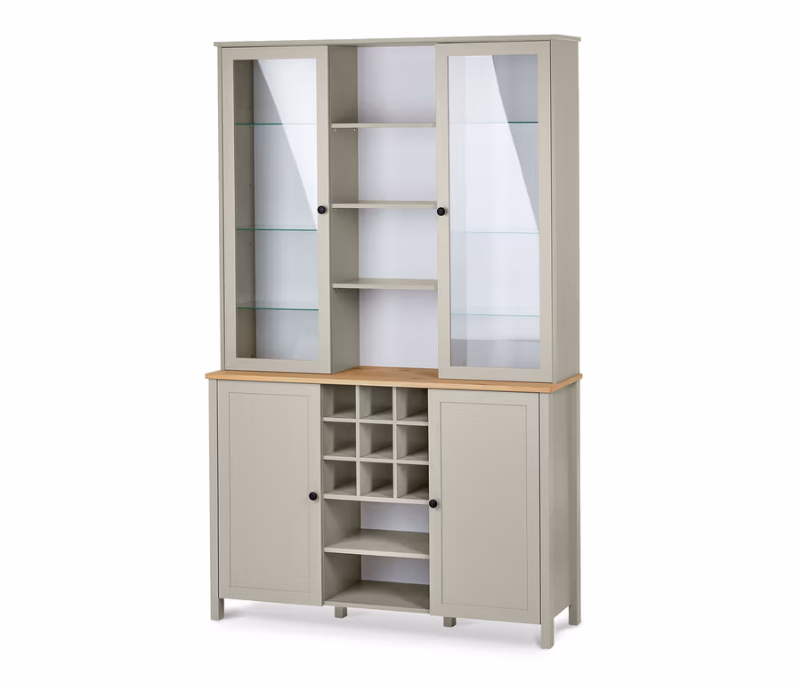- Tetszés szerint alakítható tárolóhely – a felső, üveges ajtók mögött 3-3, az alsó faajtók mögött 2-2 állítható magasságú polc található
