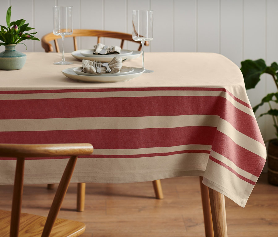 Asztalterítő, csíkos, bézs/bordó, 10 személyes