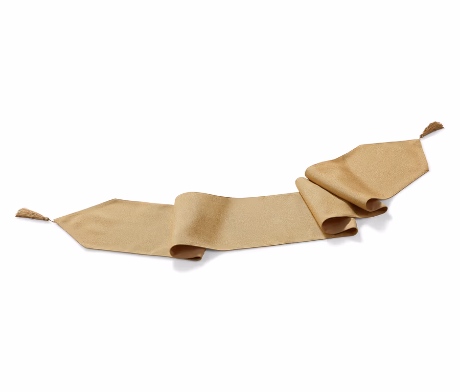 A különleges alkalmakhoz hozzátartoznak a különlegesen megterített asztalok - a különleges asztalterítők pedig kedvelik a különleges kísérőket. Akárcsak ezt az asztali futót, amely arany csillogású fonallal készült - ideális az ünnepi asztalra. Kicsúcsosodó végeit olyan bojtokkal látták el, amelyek ízléstől függően akár le is vehetők. A futó körülbelül két méter hosszú, ezért kiválóan illik nagyobb asztalokra is. Asztalterítővel vagy anélkül is használható - a legjobban azonban egy elegáns asztalterítővel együtt érvényesül.