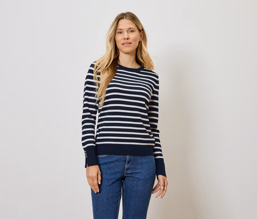 Finom kötésű pulóver, sötétkék-fehér csíkos