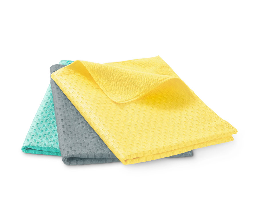 A klasszikus pamut konyharuhák szépek és jók - de néhány esetben érdemes haladni a korral a konyhában és a háztartásban is. Ez a három részben újrahasznosított, funkcionális anyagból készült, különböző színű konyharuha kiválóan alkalmas kényes poharak vagy evőeszközök gyors és csíkmentes eltörölgetéséhez és polírozásához.