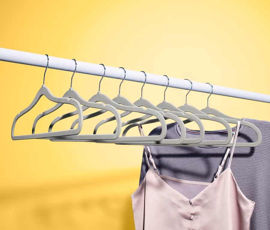 Ezek a különösen keskeny vállfák nagyobb helyről gondoskodnak a ruhásszekrényben. A ruhák az anyagkímélő és csúszásmentes flokkolásnak köszönhetően megbízhatóan a vállfákon maradnak. A stabil vállfák részben újrahasznosított anyagból állnak és átfogóval rendelkeznek a nadrágok és szoknyák számára, valamint krómozott fémből készült forgócsuklós akasztóval is ellátták őket.