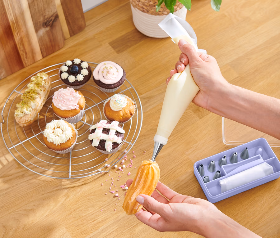 - Töltőcső a sütemény aprólékos, pontos töltéséhez