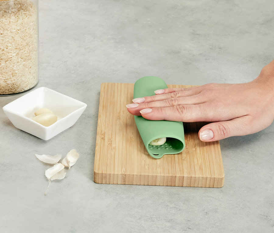 - Egyszerűen helyezze a fokhagymát a tisztítóba, és csekély nyomással görgesse ide-oda
