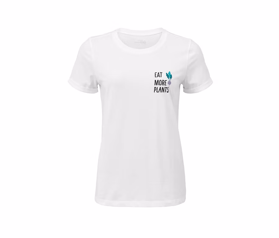• A mellrészen »EAT MORE PLANTS« felirattal