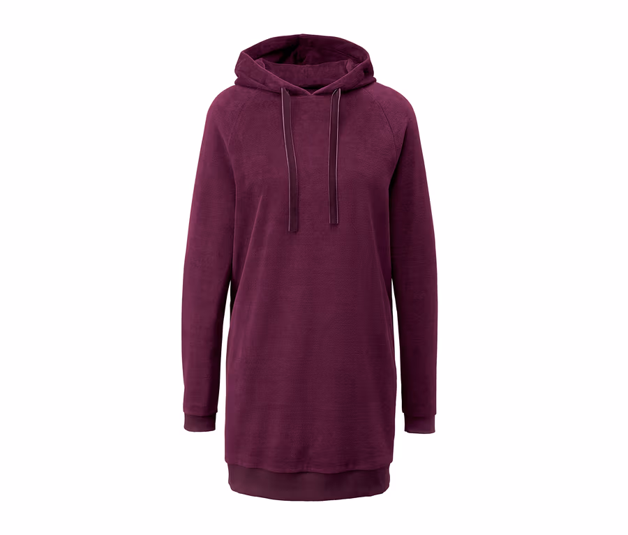 A pulóver hosszabbra szabott, lezser fazonja nem csak nagyon praktikus, hanem szép megjelenésről gondoskodik, amelyet egy kapucni és egy csillogó bársonyszalag egészít ki. A raglánujjak, valamint a derékrészen és az ujjvégeken található bordázott szegélyek különösen trendivé teszik a felsőt.