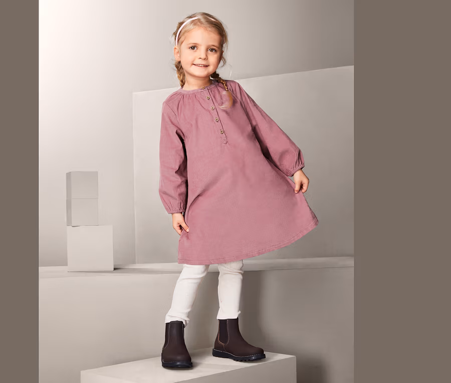 Ez a bűbájos kislány kordbársony ruha különösen kellemes viseletet biztosít, hiszen tiszta pamutból áll. Mivel azonban a gyerekeknek nem csak a kényelem fontos, hanem az is, hogy a ruha sok mindent kibírjon, a kord anyag hosszú élettartama és erőssége is éppen kapóra jön. A stílusos megjelenésről az a húzott, gombos ujjszegély és a gomboláspánt gondoskodik, amely az öltöztetést is megkönnyíti. Az A-vonalú szabással készült ruha kellően szabad mozgást biztosít szaladgálás és játszás közben. További pluszpont: a felhasznált pamut bio!