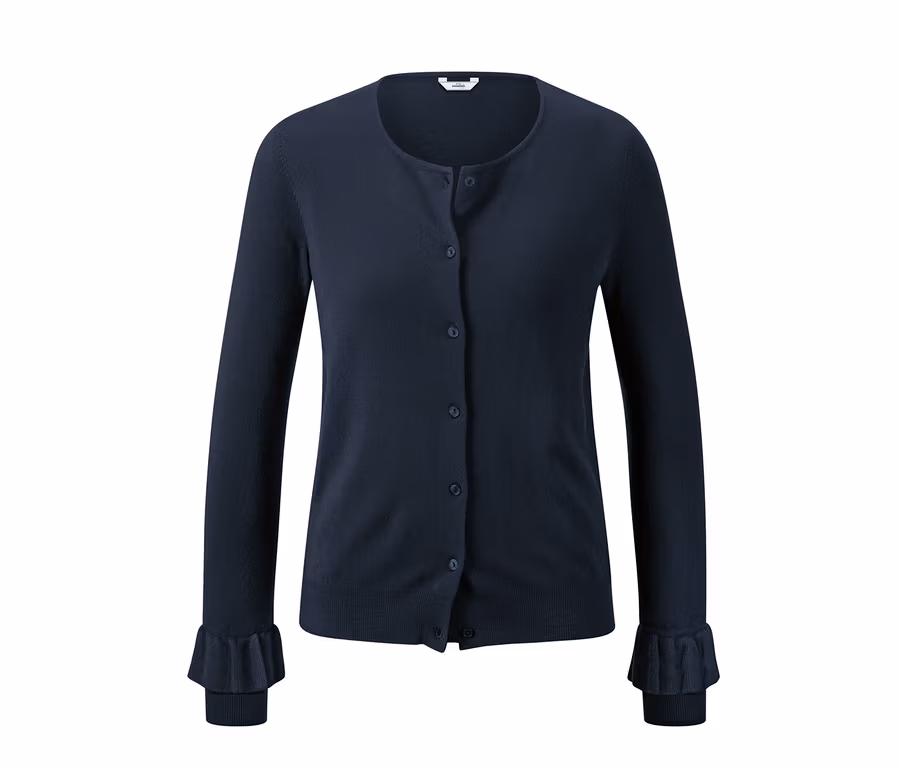 Ez a finom kötésű felső csaknem minden öltözékhez ideális. A különösen puha, kevert viszkózanyagból készült könnyű ruhadara kerek nyakkivágással rendelkezik és gomboláspánttal zárható. A derékrészen és az ujjvégeken található bordázott szegély könnyű tartást biztosít, az ujjakon lévő mutatós fodor pedig divatos részletként szolgál. Ezen kívül az elasztán formatartást, tökéletes illeszkedést és rendkívül kényelmes viseletet kölcsönöz a szövetnek.